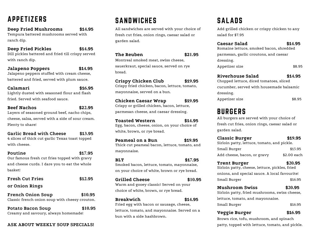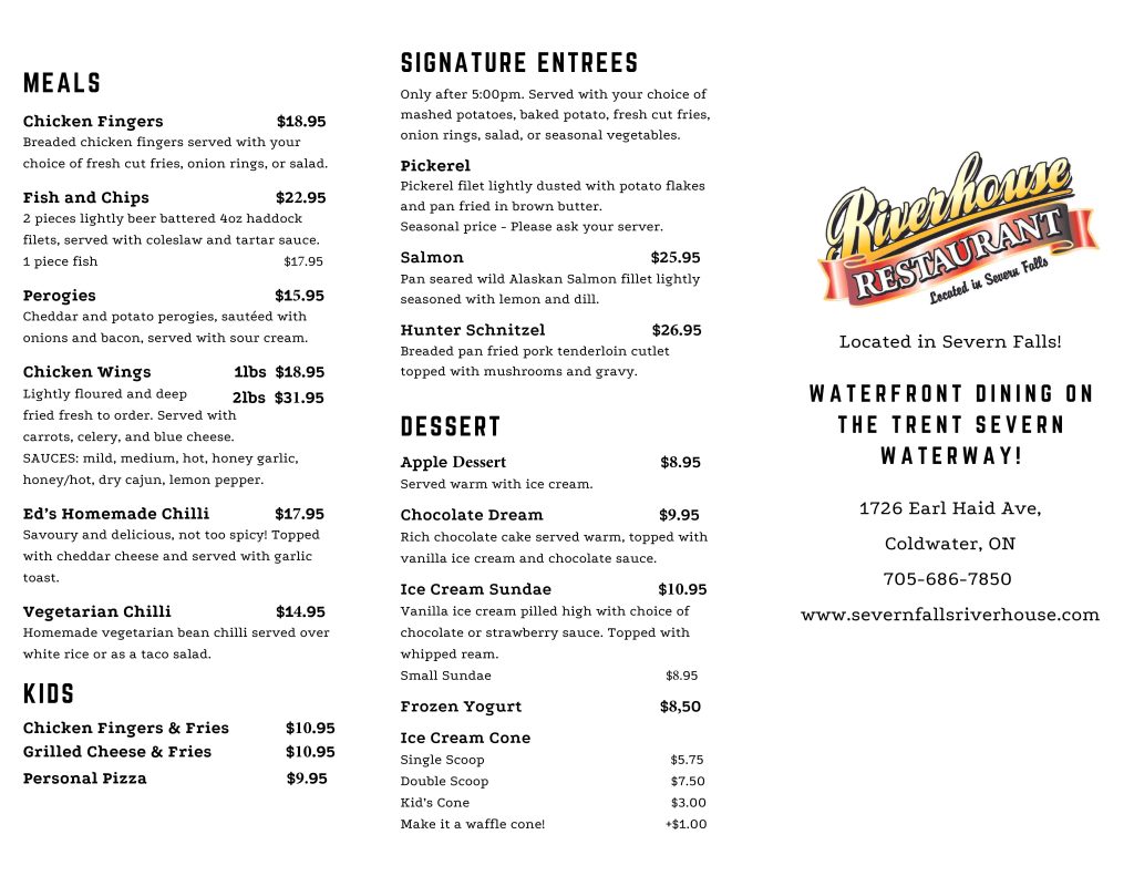 Take-Out Menu Click to Enlarge Menu Hours Fall 2025 Friday 11 to 9 pmSat and Sun 11 to 8 pm Open Thanksgiving Monday11 am to 6 pm Our Annual End of Season Open House November 15 – 1 to 4 pmAnd then closed for the season